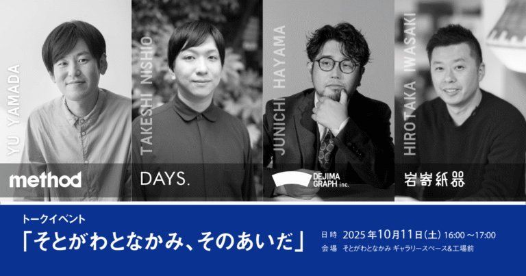施設のオープンに合わせ、本施設のグラフィックデザインを担当したブランディングデザイン事務所「DEJIMAGRAPH Inc.」による展示を開催します。全国の企業から依頼が集まるDEJIMAGRAPH Inc.は、岩㟢紙器とも長く協業してきました。これまでの協業で生まれたパッケージデザインワークを中心に、完成までのエピソード、今回の展示のために制作したポスターなどを展示します。